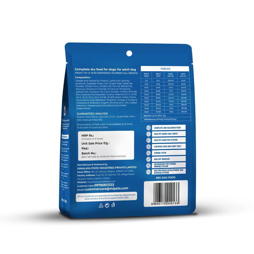MI Pets Everyday Adult Dog Food is a dry-kibble dog food designed as a complete and balanced diet for adult dogs of all breeds.This formula typically uses high-quality animal protein (like lamb or chicken and their by-products) paired with rice and other digestible carbohydrate sources, making it easier on the stomach and good for digestion.Along with meat and grains, it includes cereals or cereal-byproducts, vegetable fibers, vitamins, minerals, omega-3 and omega-6 fatty acids, prebiotics and probiotics — all aimed at supporting overall health, digestion, immune function, and maintaining a healthy skin and coat.Because of its balanced nutrition, MI Pets Everyday Adult Dog Food supports healthy muscles, bones and joints, and meets the daily nutritional needs of an adult dog for energy, maintenance and vitality.this dog food provides a wholesome, digestible, and nutrient-complete diet for adult dogs, helping them maintain good digestion, healthy skin and coat, strong body structure, and overall well-being.
